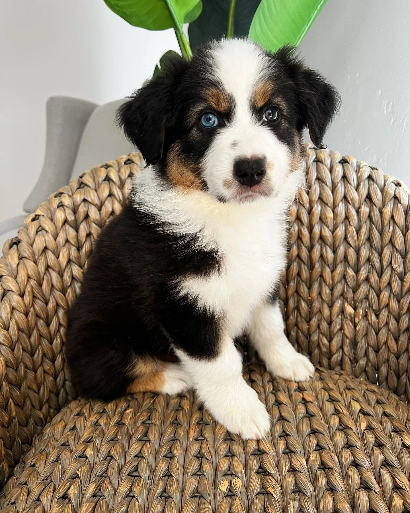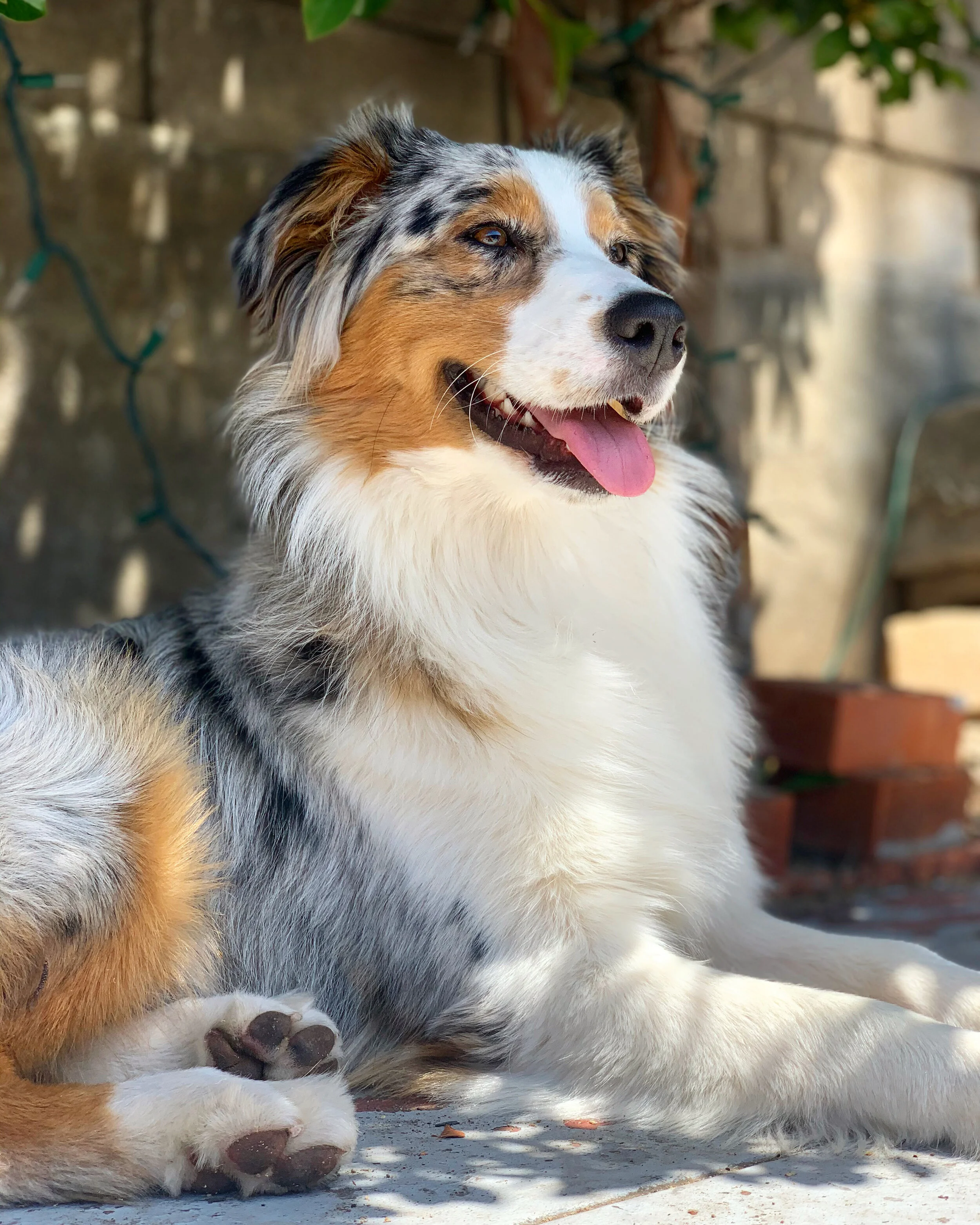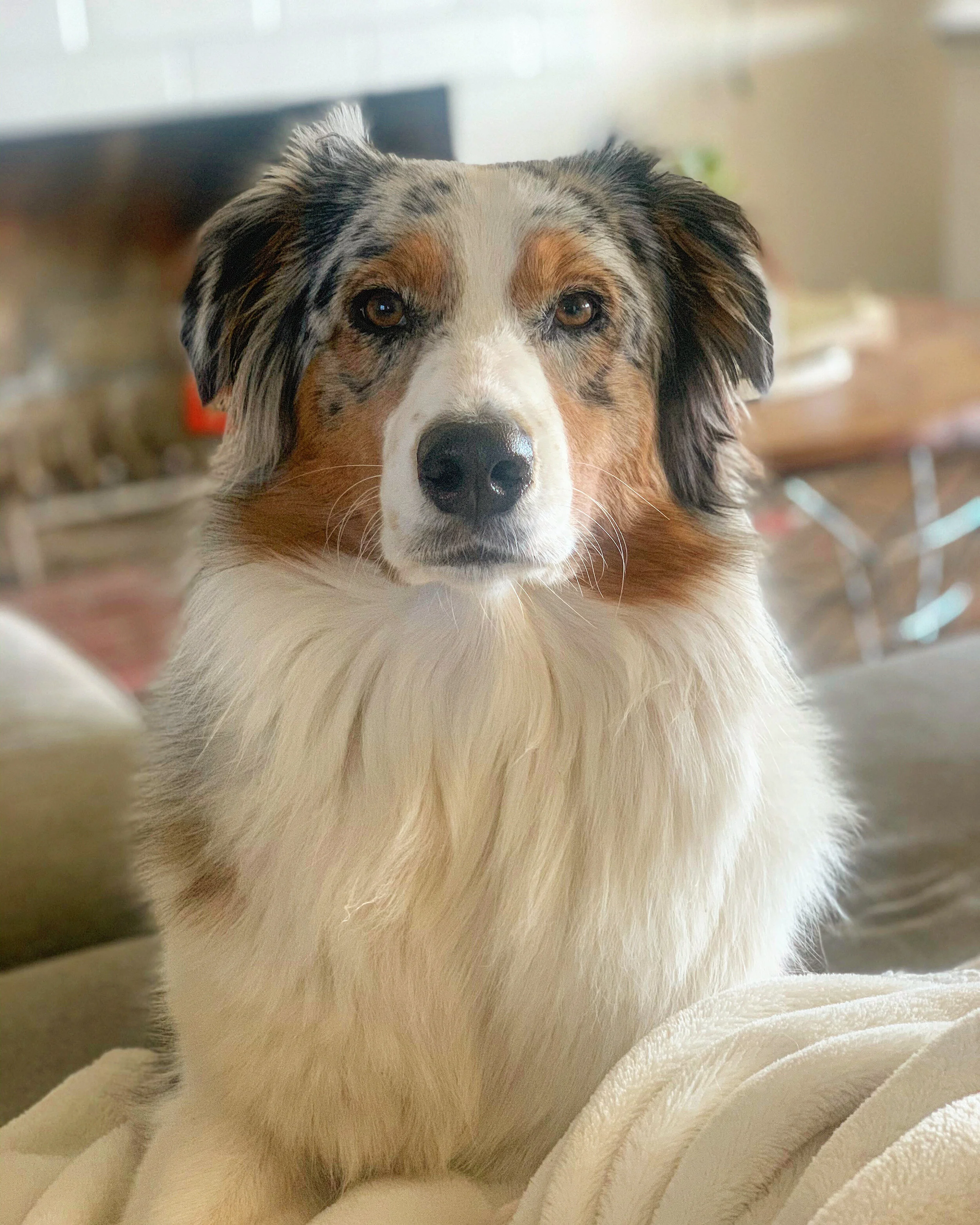 Emmie was the sweetest and calmest pup in the litter, her temperament was why we kept her. She grew up to be an absolutely gorgeous red tri with striking blue eyes, which was a bonus! She is extremely intelligent, affectionate and loyal. She has always been more of a people dog than a dog dog which has made her recall excellent. Emmie is perfectly behaved around kids and naturally assumes the role of being their baby sitter. She is very athletic and loves to cuddle on the couch at the end of the day.